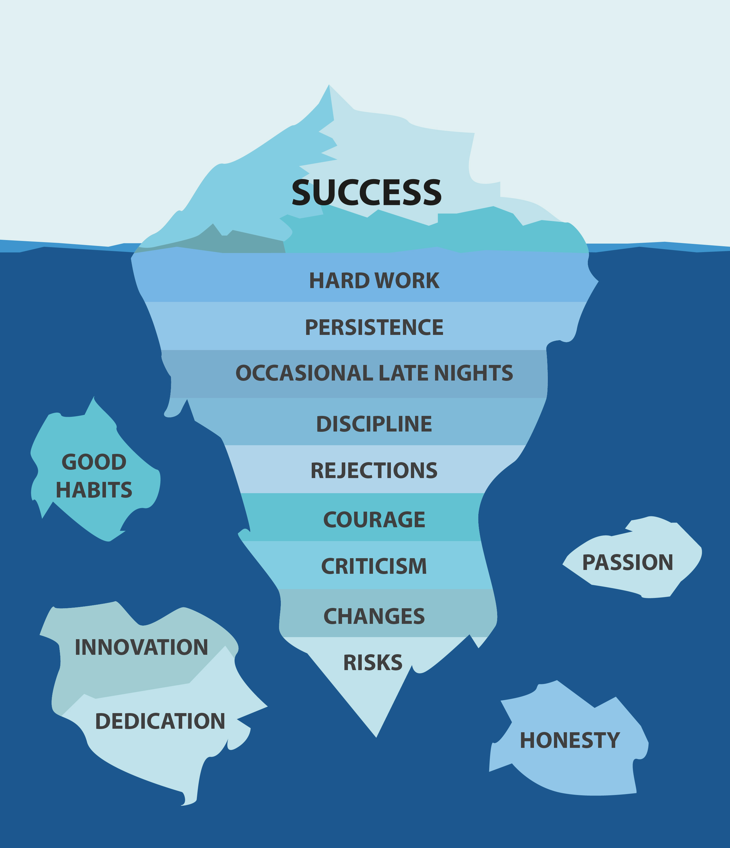 We want our clients to be successful; accomplishing a desired aim or result and we work hard to make sure that happens, but success is only the tip of the iceberg: what people see and what happens behind the scenes is often very different. Underneath the tip of the iceberg, the journey to the top often involves a lot of persistence, good habits, hard work and dedication too as demonstrated by our iceberg infographic!